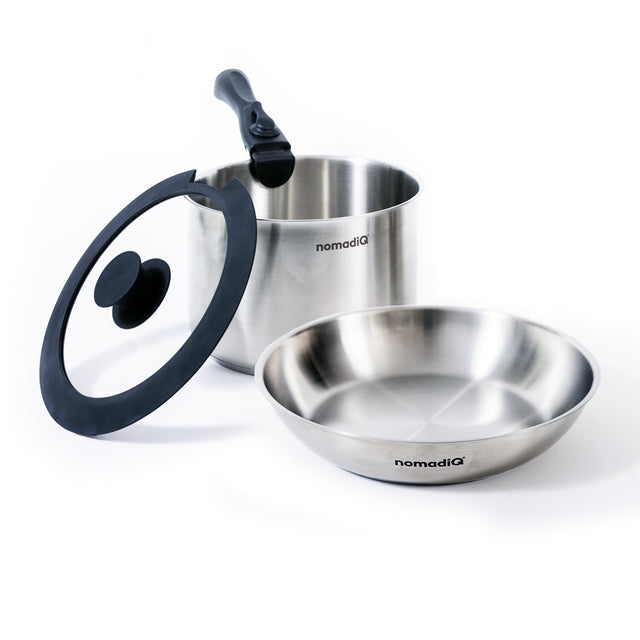 Discover premium cooking on the go with the nomadiQ Premium Stainless Steel Cookware Set: the durable cookware set for camping, outdoor cooking, and every adventurous meal. Thanks to the high-quality 3-ply clad construction with an aluminum core, heat is distributed quickly and evenly for perfect results every time.